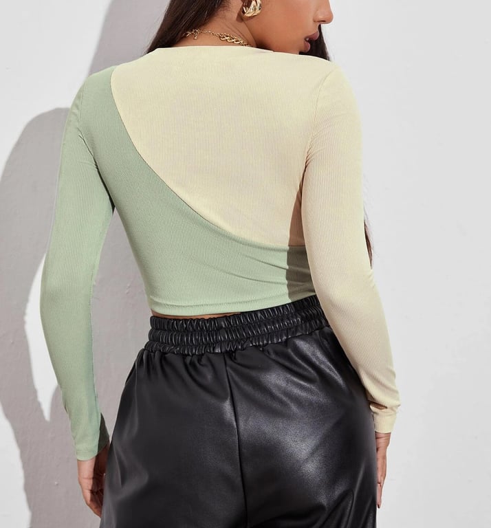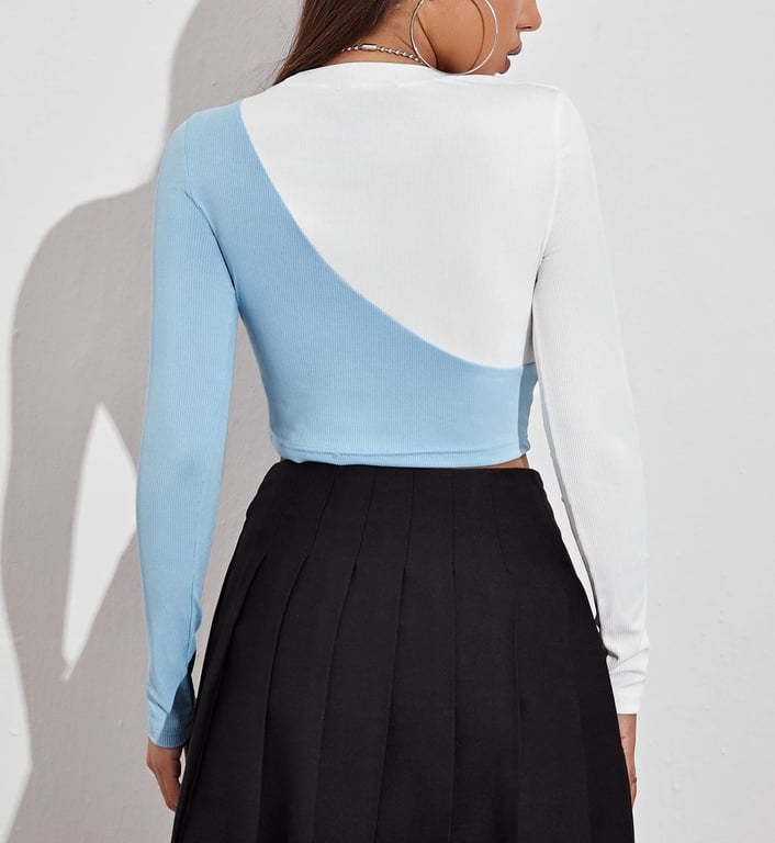 Etichette: Aspetto originale, t-shirt da donna, abbigliamento da donna, taglio asimmetrico, t-shirt asimmetrica, t-shirt bicolore, t-shirt a maniche lunghe