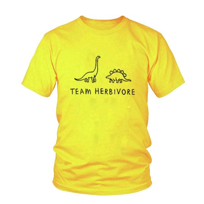 La maglietta ha un colore e una stampa bianca o nera con dinosauri erbivori. È adatta per l'uso quotidiano e per attività sportive e piacerà a ogni vegetariano e vegano.