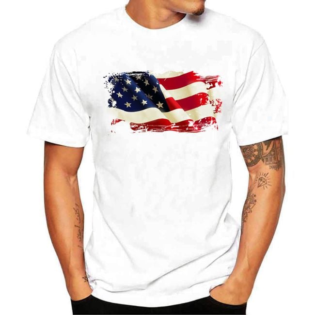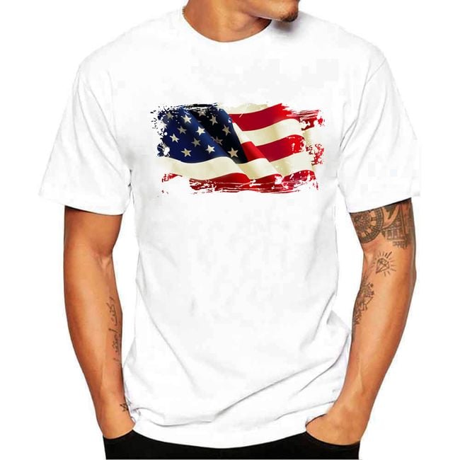 T-shirt bianco classico a maniche corte è stampato sul petto con l'immagine della bandiera americana.