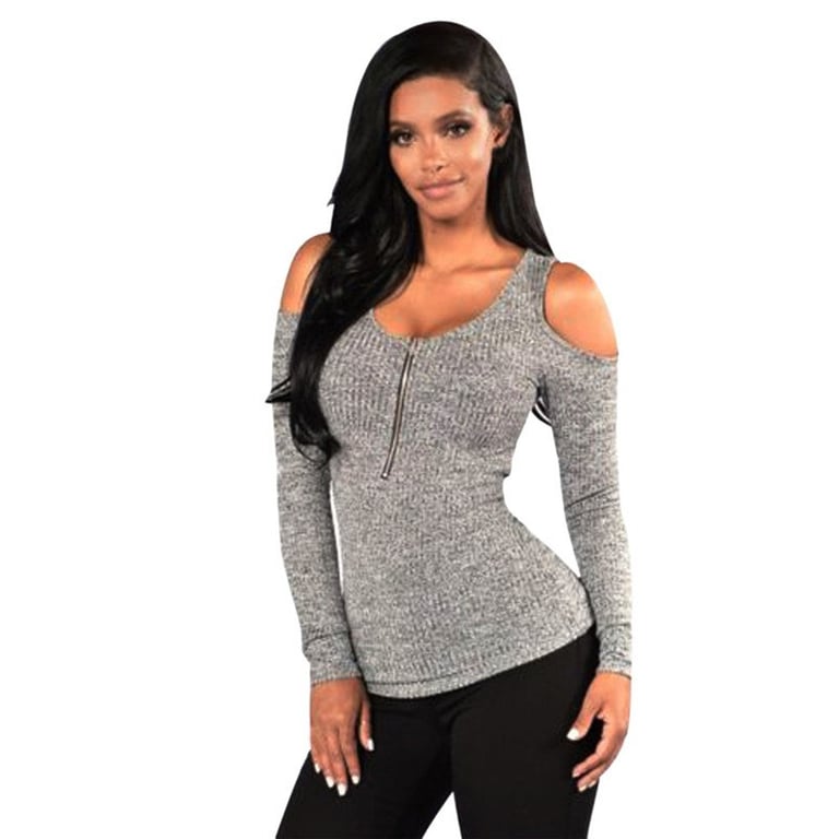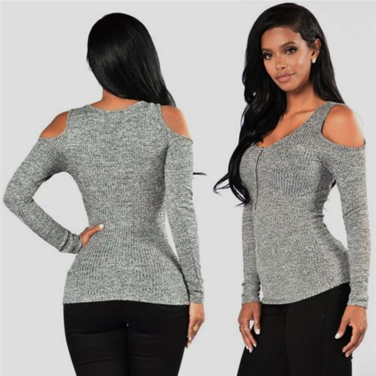 T-shirt per donne eleganti. Ha maniche lunghe con spalle scoperte e scollatura rotonda con zip.