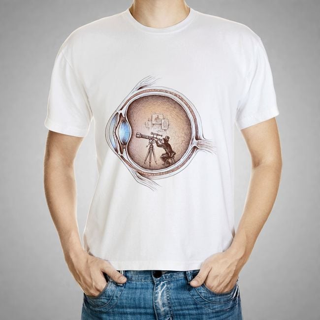 La maglietta ha una stampa di un omino seduto al centro di un occhio. Questa stampa è molto originale e adatta a ogni ricercatore.