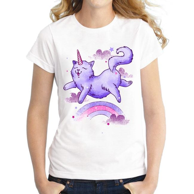 La maglietta da donna a maniche corte è stampata con un allegro gattino viola che gioca a fare l'unicorno e si libra sopra un arcobaleno. Il tessuto è piacevole al tatto ed è di colore bianco. Sono disponibili diverse taglie. La tabella delle taglie si trova qui sotto nelle caratteristiche del prodotto.