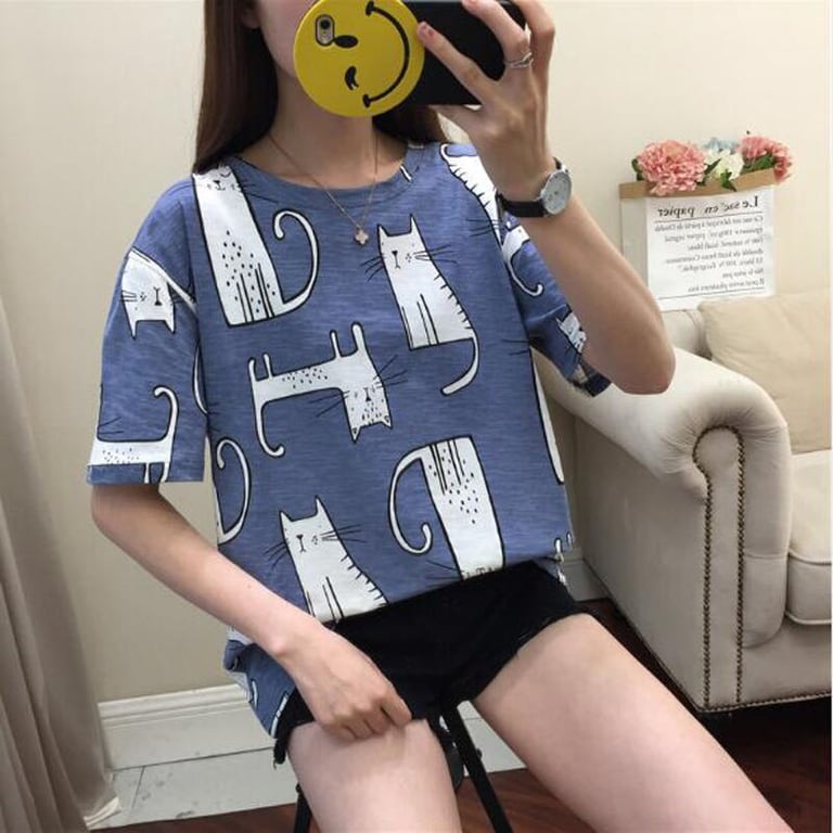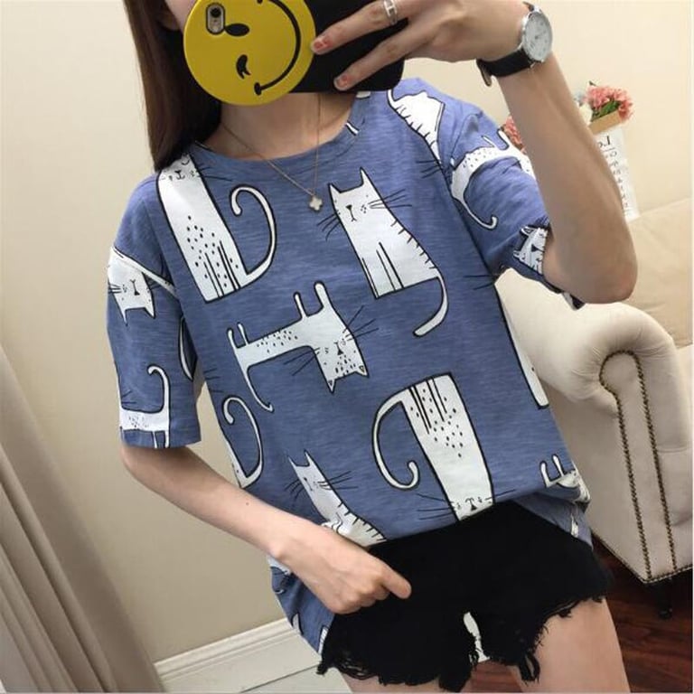 T-shirt da donna a maniche corte con scollo rotondo. Stampa colorata con motivo di gatti. Taglio ampio. Disponibile in due colori.