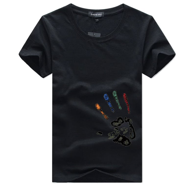 T-shirt da uomo a taglio libero con maniche corte e scollatura rotonda. Stampa colorata di una mano sul davanti. Disponibile in diverse varianti di colore.