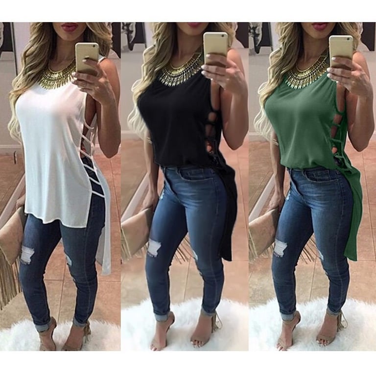 Bellissima e stilosa maglietta per l'estate. È senza maniche e con aperture alla moda sui lati. È disponibile in tre colori.