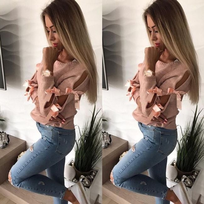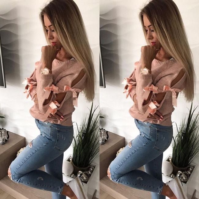 Un maglione monocolore con scollo rotondo ha dei fiocchi sulle maniche. Lo spazio tra i fiocchi è formato da aperture che rivelano la pelle.