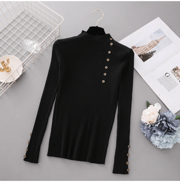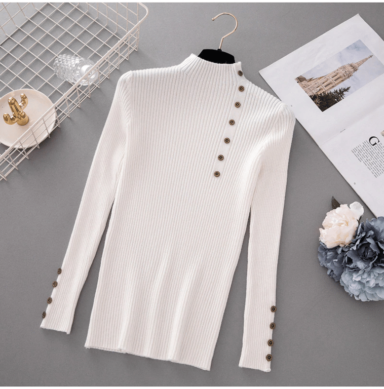 Elegante maglione con colletto basso. È decorato in modo stiloso con bottoni. È disponibile in molti colori.