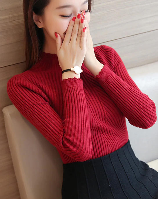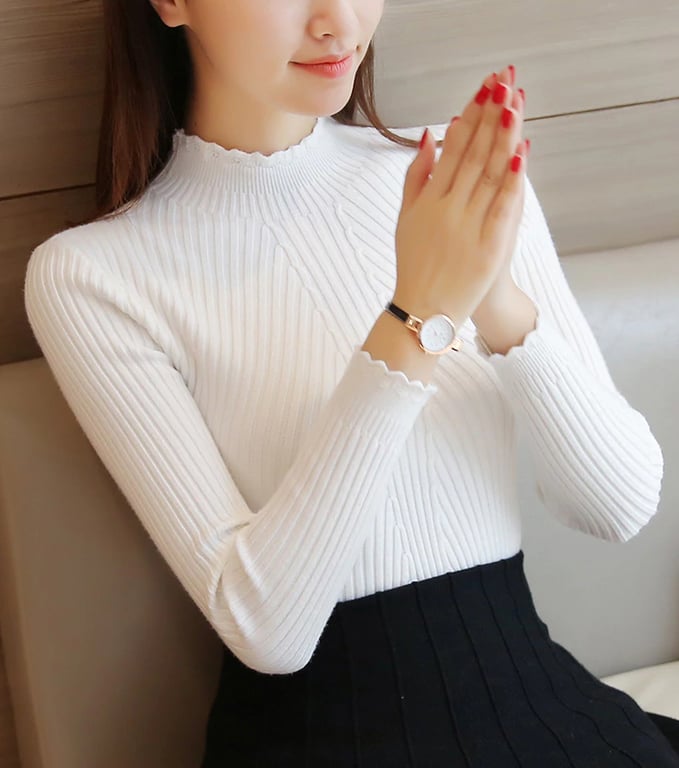 Maglione femminile delicato con romantiche curve sull'orlo. Ha un collo alto e si adatta sia a eventi formali che al tempo libero.