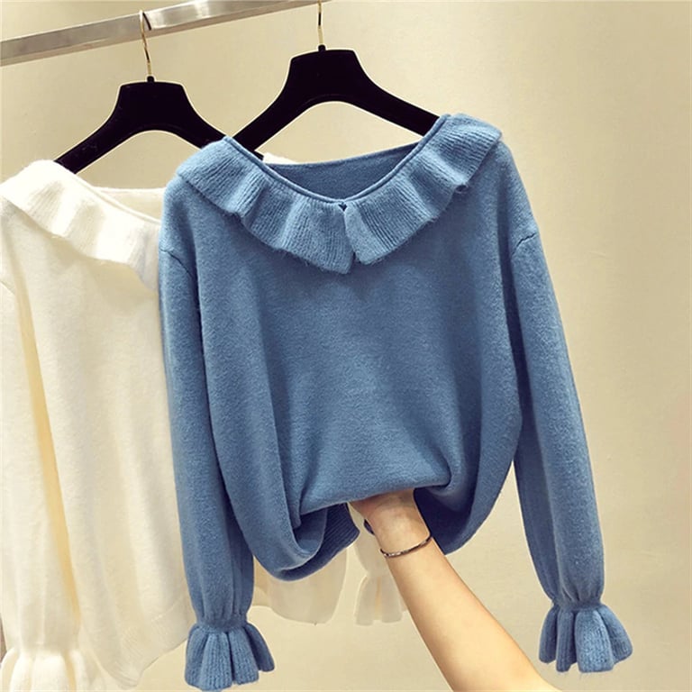 Maglione elegante primaverile con un ampio scollo decorato da un grande volant. Ha maniche lunghe, leggermente elastiche alla fine con volant. È facilmente abbinabile.
