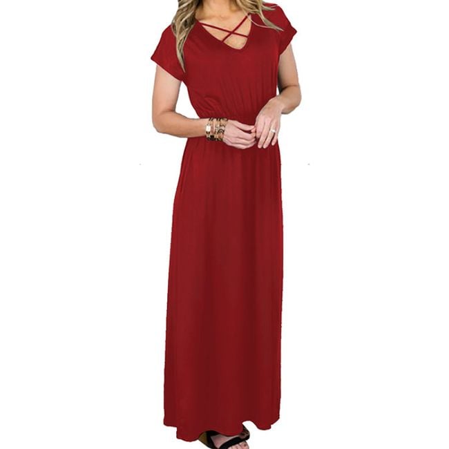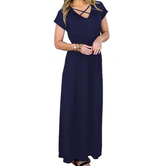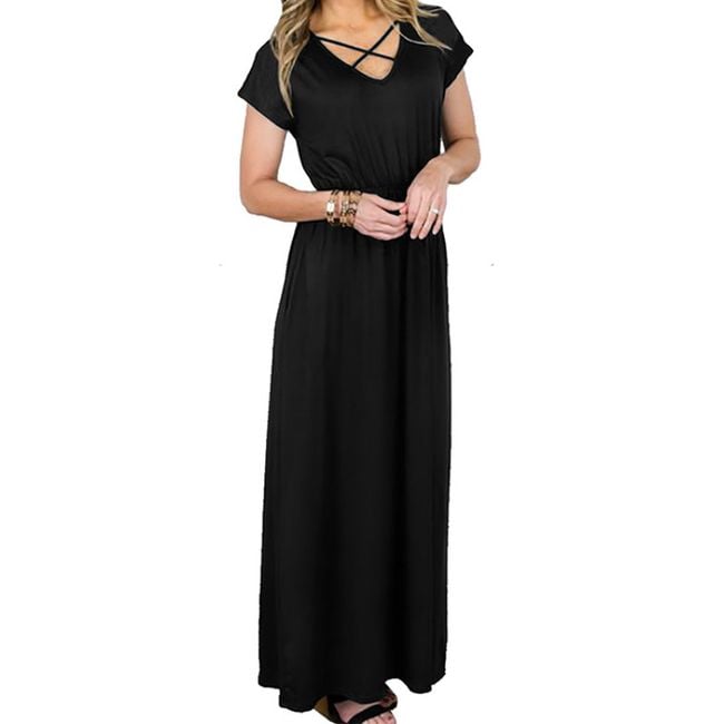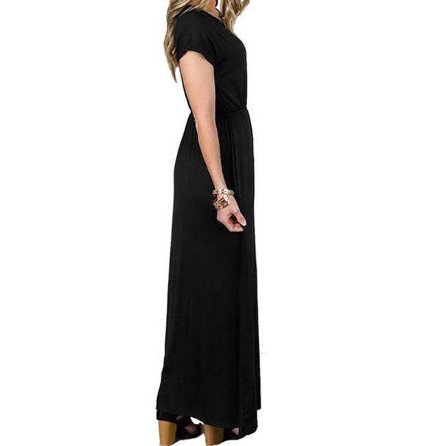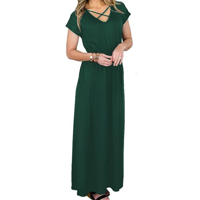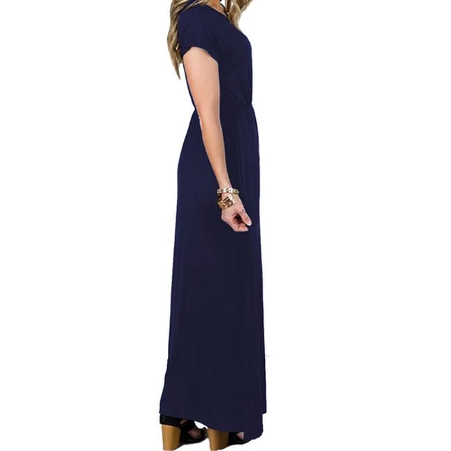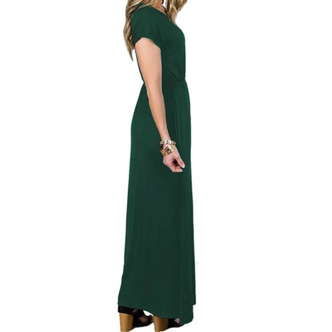 Il vestito arriva fino alle caviglie e ha maniche corte.