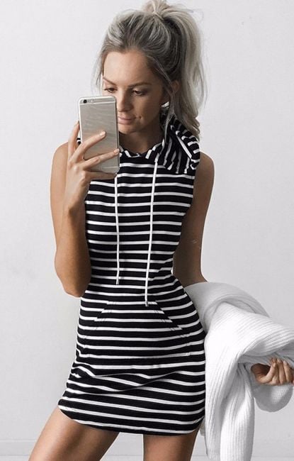 Bellissimi vestiti in felpa con cappuccio e tasca a marsupio si distinguono per il loro materiale piacevole e la leggerezza. I vestiti sono senza maniche e in colori piacevoli.