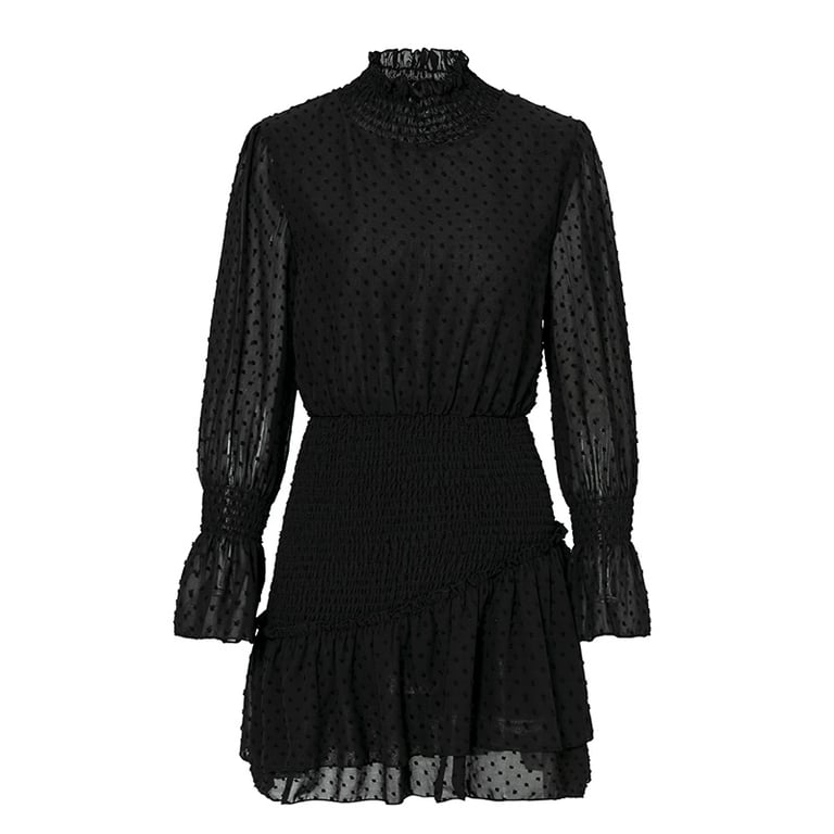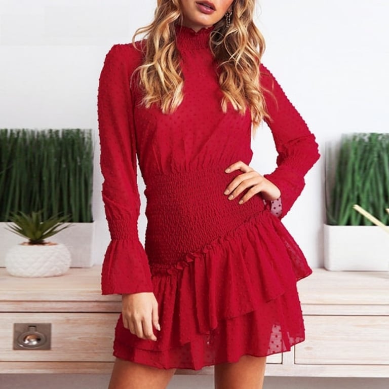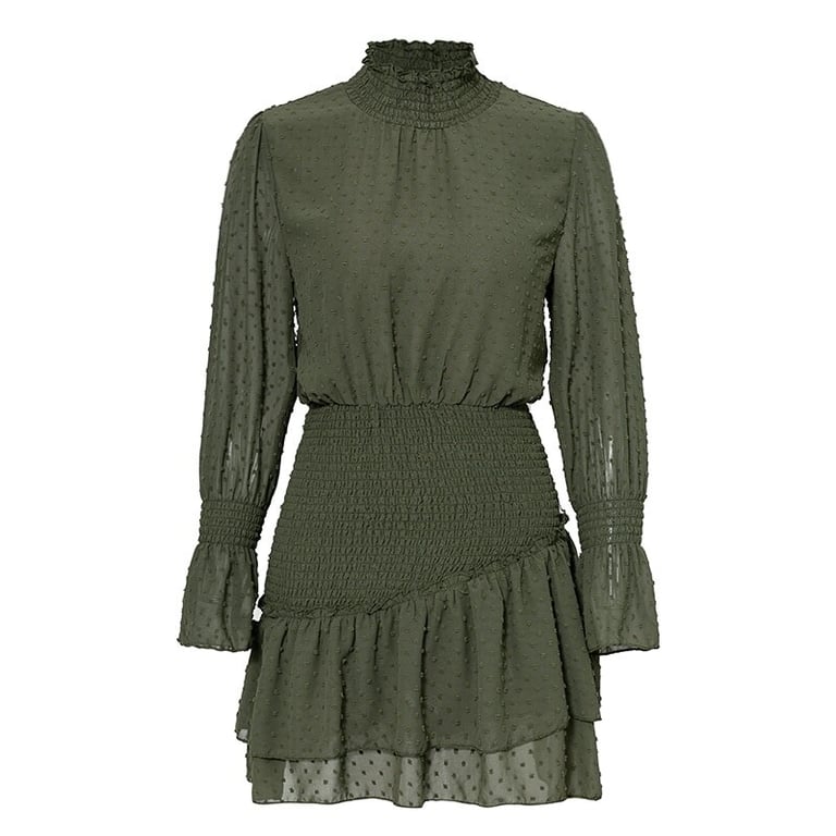 Abito romantico autunnale a collo alto con gonna a volant a strati.