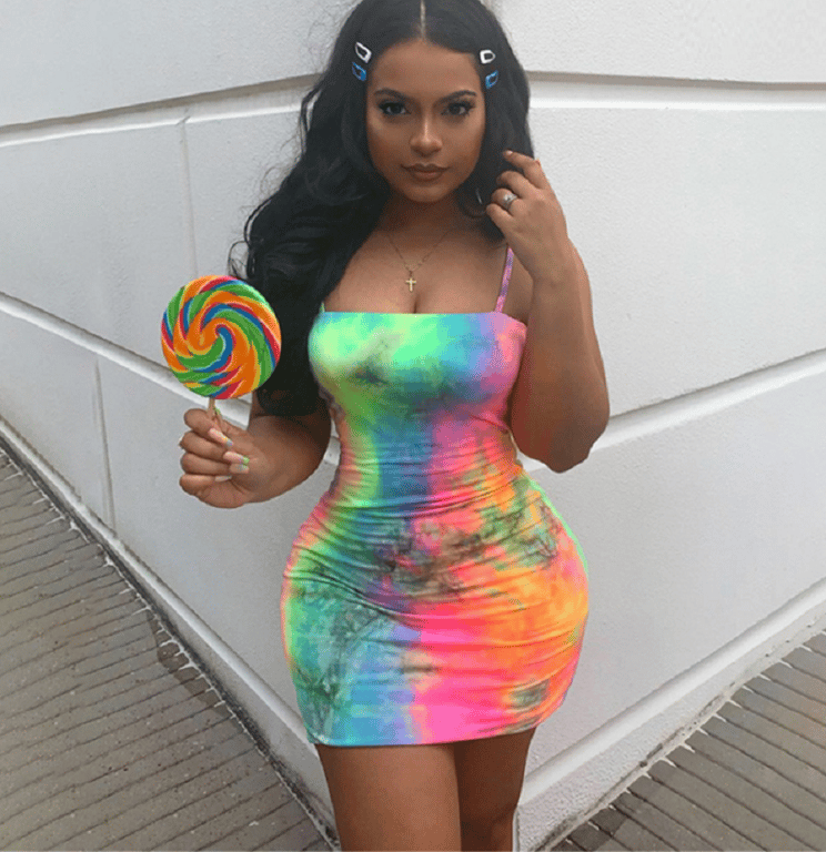 Abito mini estivo in tessuto elasticizzato con colori arcobaleno brillanti.