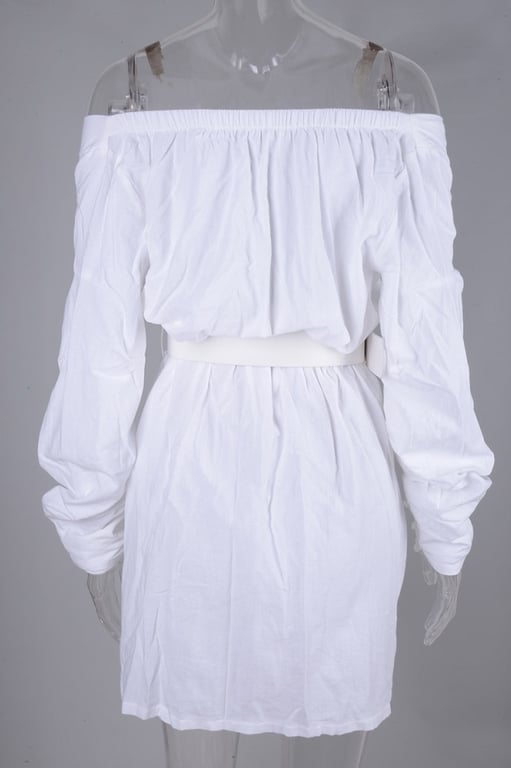 Abito mini da donna con maniche lunghe e spalle scoperte.