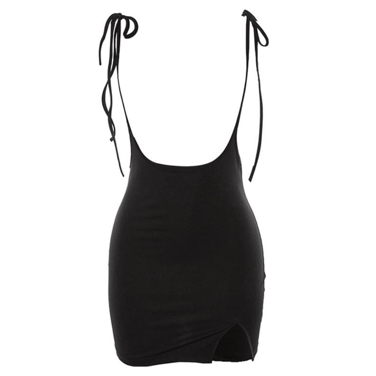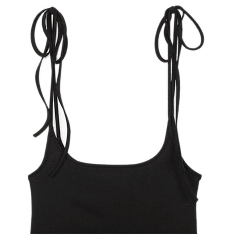 Originale mini abito nero sotto il seno con spalline da annodare.
