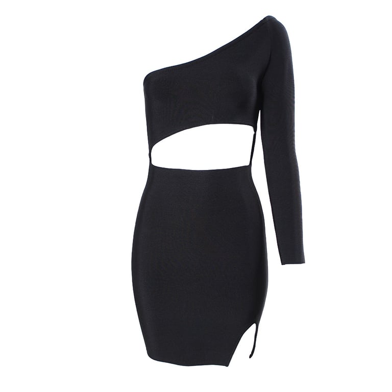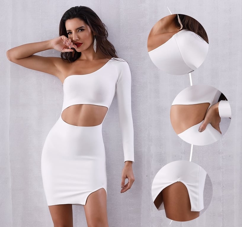 Abito mini da donna in un design originale con una spalla scoperta.