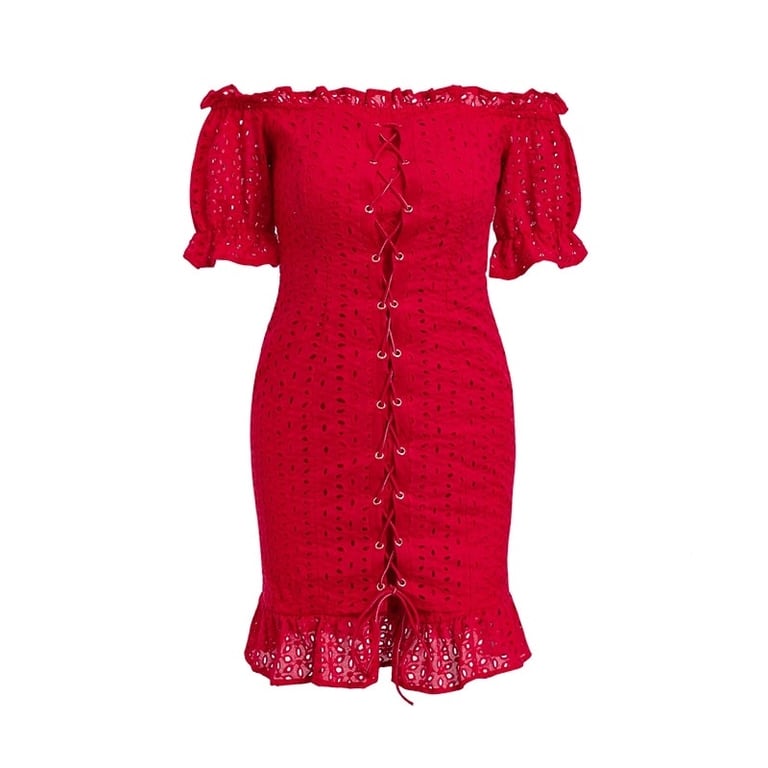 Mini abito da donna in pizzo. Con maniche corte e lacci.