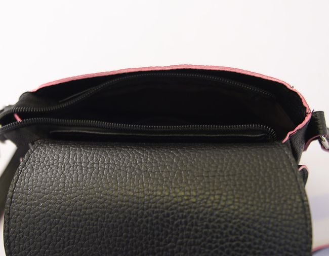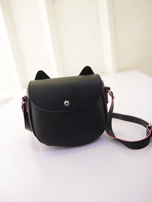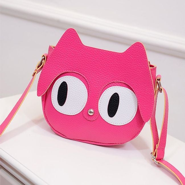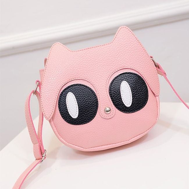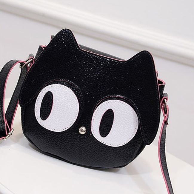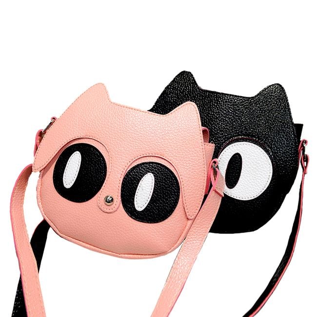La deliziosa borsa di dimensioni più piccole è realizzata a forma di testa di gatto, con grandi occhi e un bottone al posto del muso.