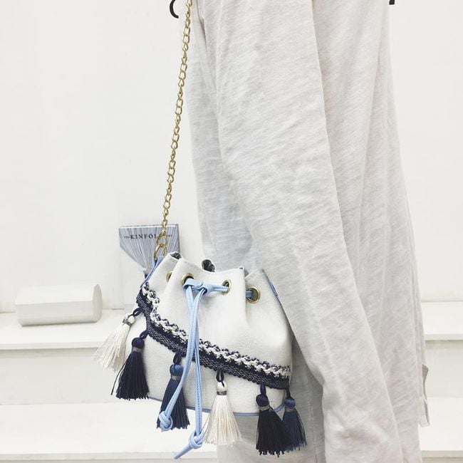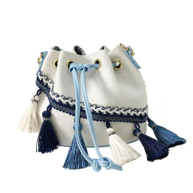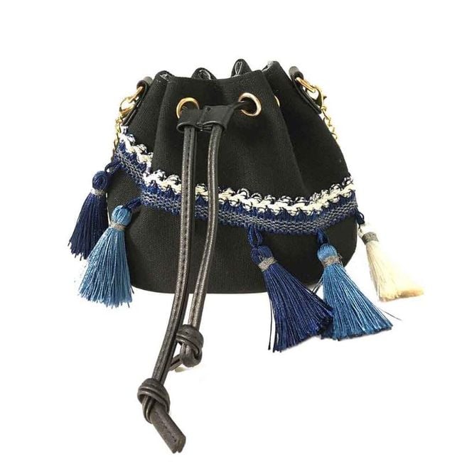 La borsa è molto piccola, ha una chiusura con cordino ed è decorata con piccole frange.
