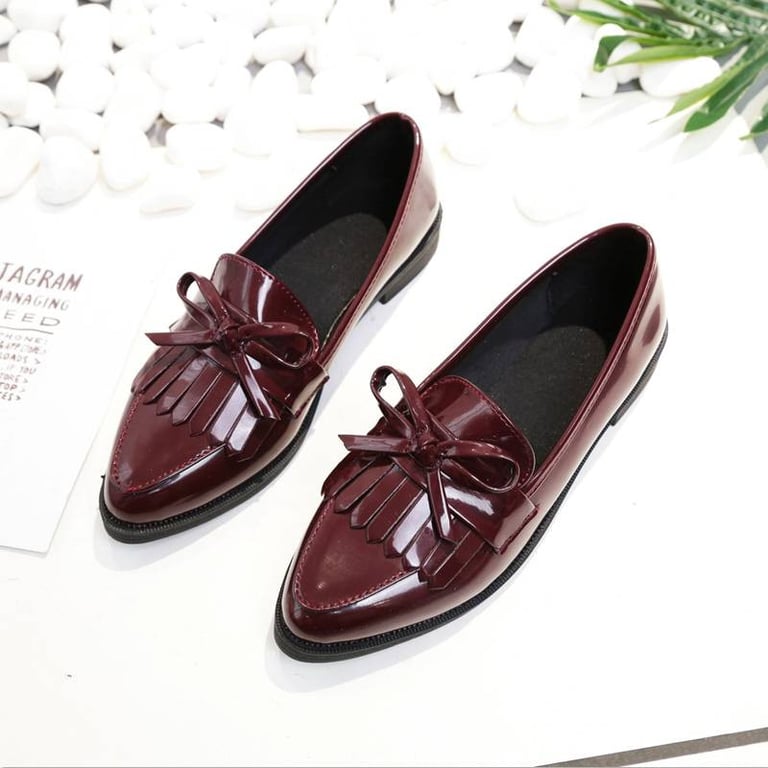 Mocassini lucidi da donna con fiocco e frange. Suola piatta senza tacco. Punta affilata. Aspetto in pelle. Disponibile in più varianti.