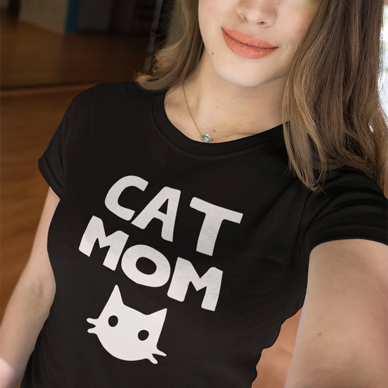 T-shirt da donna con stampa di gatto e scritta. La maglietta ha una vestibilità ampia e dritta, maniche corte e scollatura rotonda. Disponibile in diverse varianti di colore.