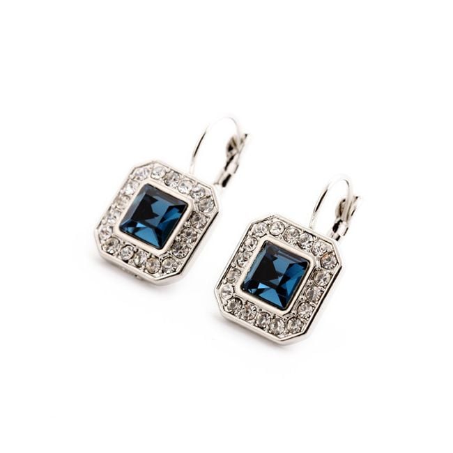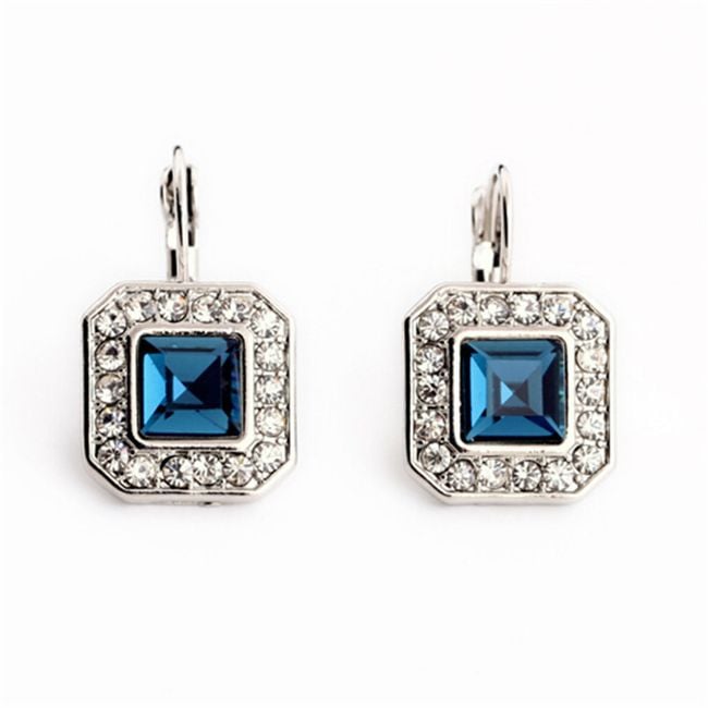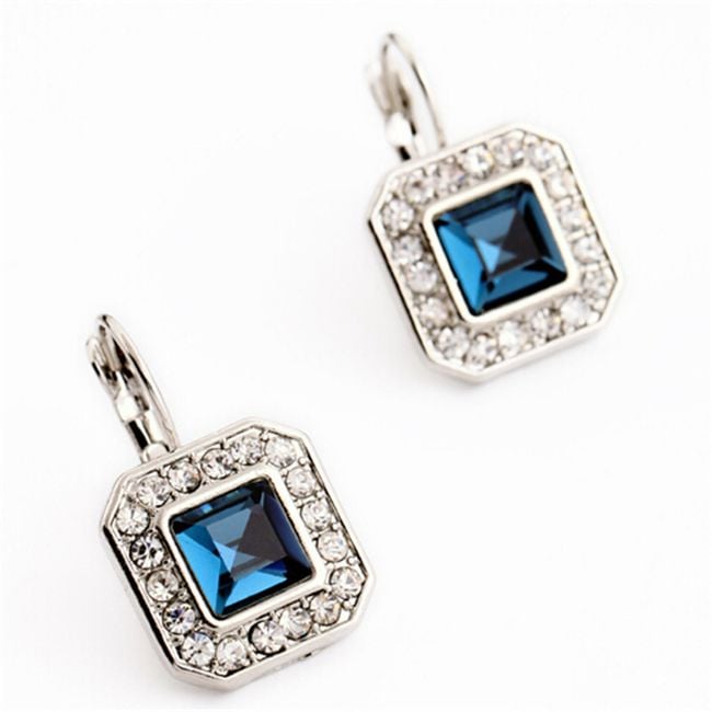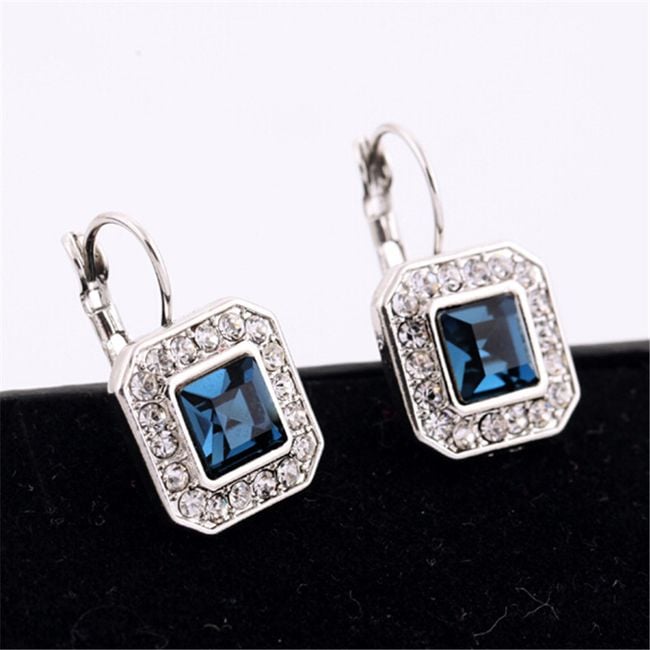 Questi splendidi orecchini faranno felice ogni donna come un regalo attento e bello. Il materiale è decorato con piccole pietre insieme a una grande pietra blu squadrata. Gli orecchini sono adatti a tutti i colori di capelli. Risaltano su un'acconciatura raccolta.