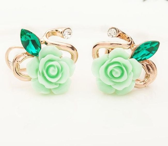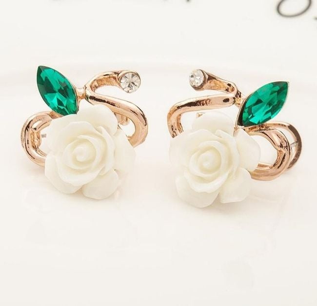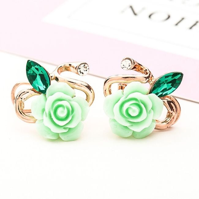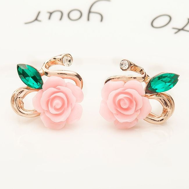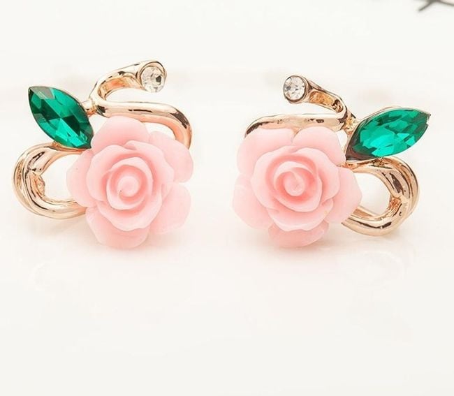 Orecchini femminili delicati con una rosa e pietre preziose.