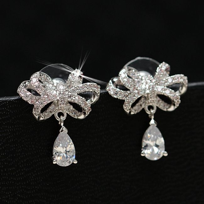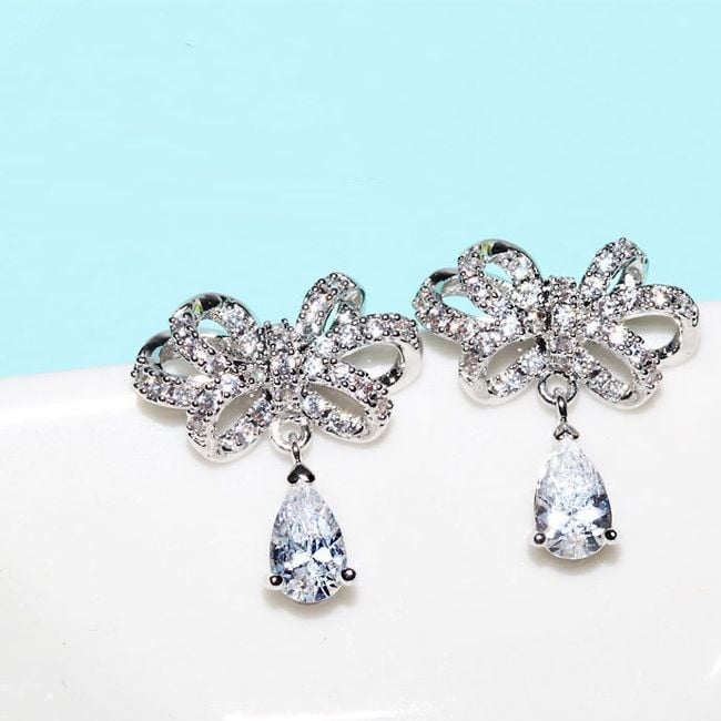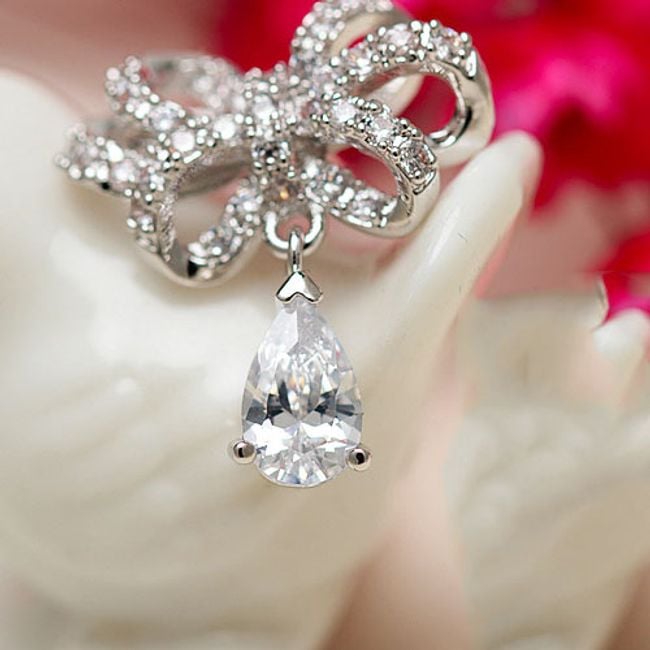 Questi orecchini magici saranno un accessorio originale e bellissimo. Sono adatti per l'uso quotidiano e saranno anche un gioiello perfetto per il vostro abbigliamento serale. Un interessante fiocco è completato da una goccia, il tutto è armonizzato in colore argento.