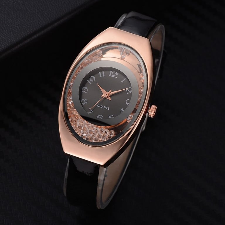Orologi eleganti da donna con cinturino dall'aspetto in pelle e un quadrante numerico con una soluzione interessante. Disponibile in due varianti di colore.