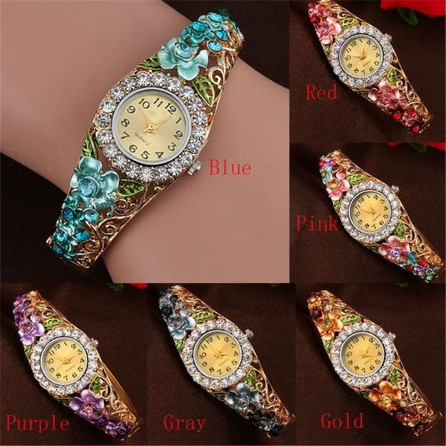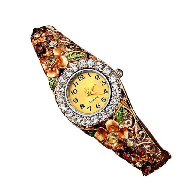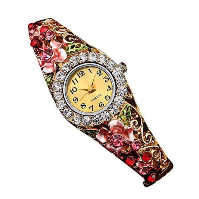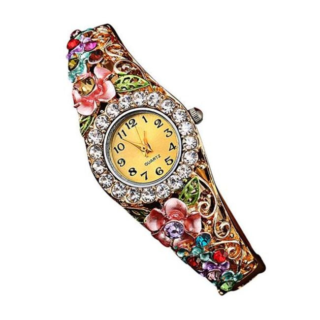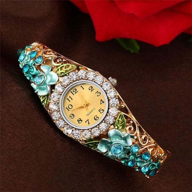 L'orologio è decorato con bellissimi cristalli e ha un quadrante chiaro.