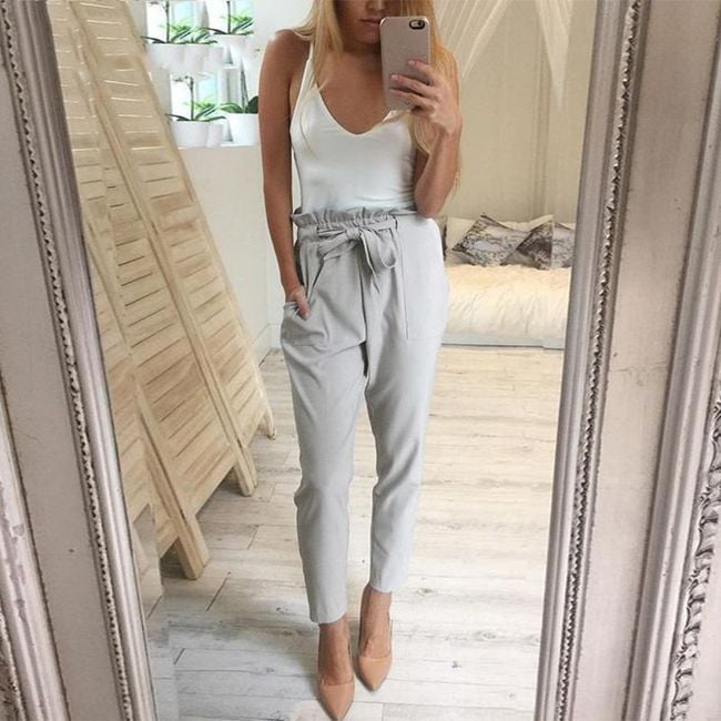 Pantaloni da donna a vita alta sono in una vestibilità slim e si distinguono per un interessante elemento a forma di fiocco sul davanti. Sono disponibili in 3 varianti di colore.