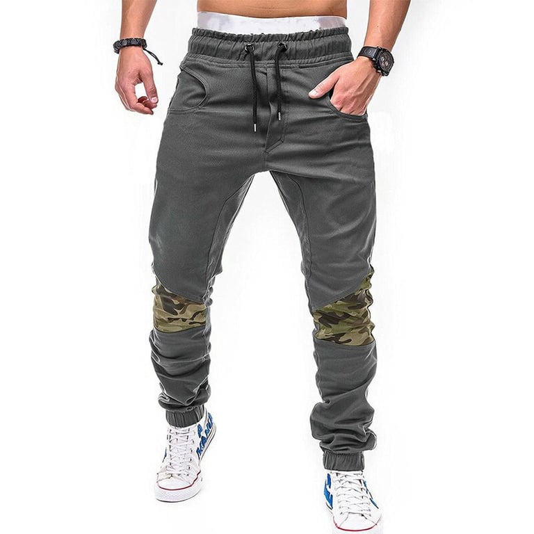 Pantaloni da uomo con vita elastica in gomma e lacci per stringere. Pantaloni affusolati con gomma e toppe mimetiche. Disponibili in più varianti.