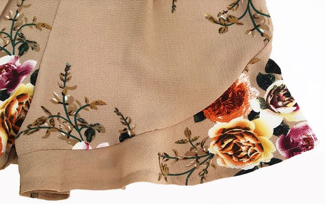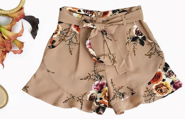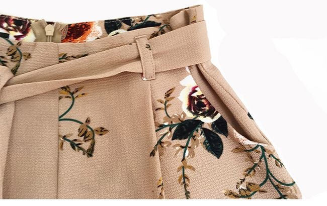 Eleganti pantaloni corti larghi sono coperti da una interessante stampa floreale.
