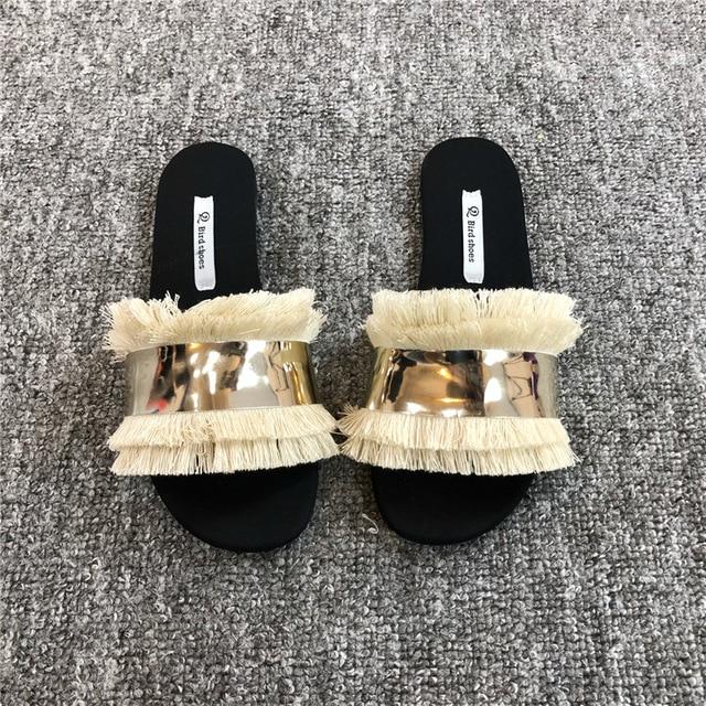 Eleganti pantofole da donna con frange e dettagli dorati alla moda.