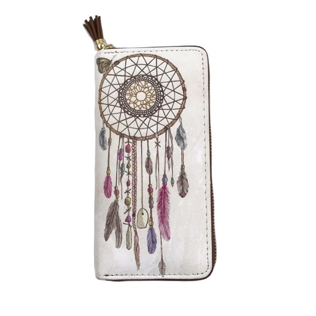 Portafoglio da donna con motivi astratti creativi di catturatori di sogni e piume in colori piacevoli. Il portafoglio è molto spazioso e può contenere anche alcuni modelli di iPhone. All'interno troverete una tasca con chiusura a zip, scomparti per banconote e slot per carte di pagamento. Un bellissimo accessorio alla moda e pratico per ogni donna.