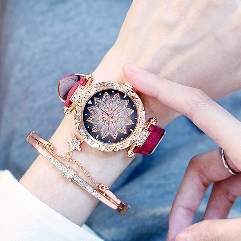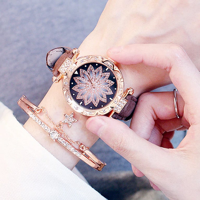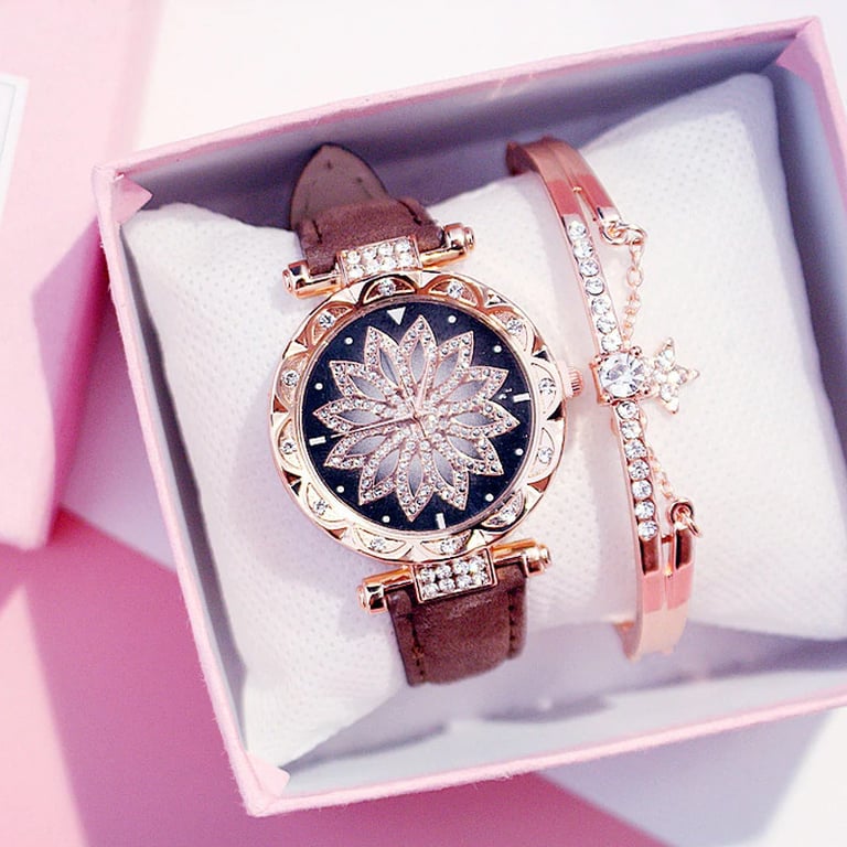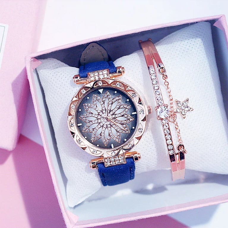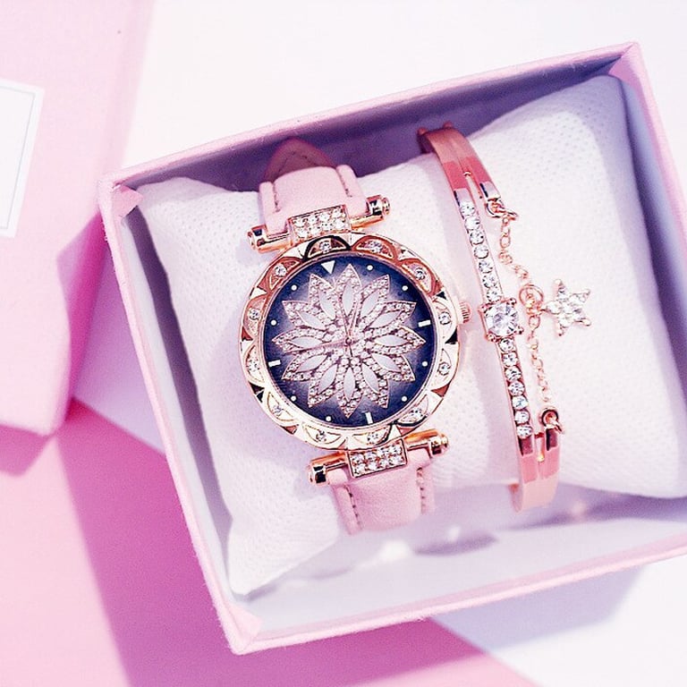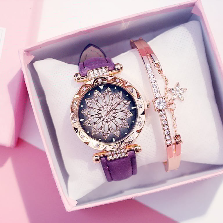 Un regalo di lusso per tutte le donne sotto forma di orologi eleganti e bracciali con vetro smerigliato a forma di attraenti falsi diamanti. Il bracciale è decorato con una delicata stella.