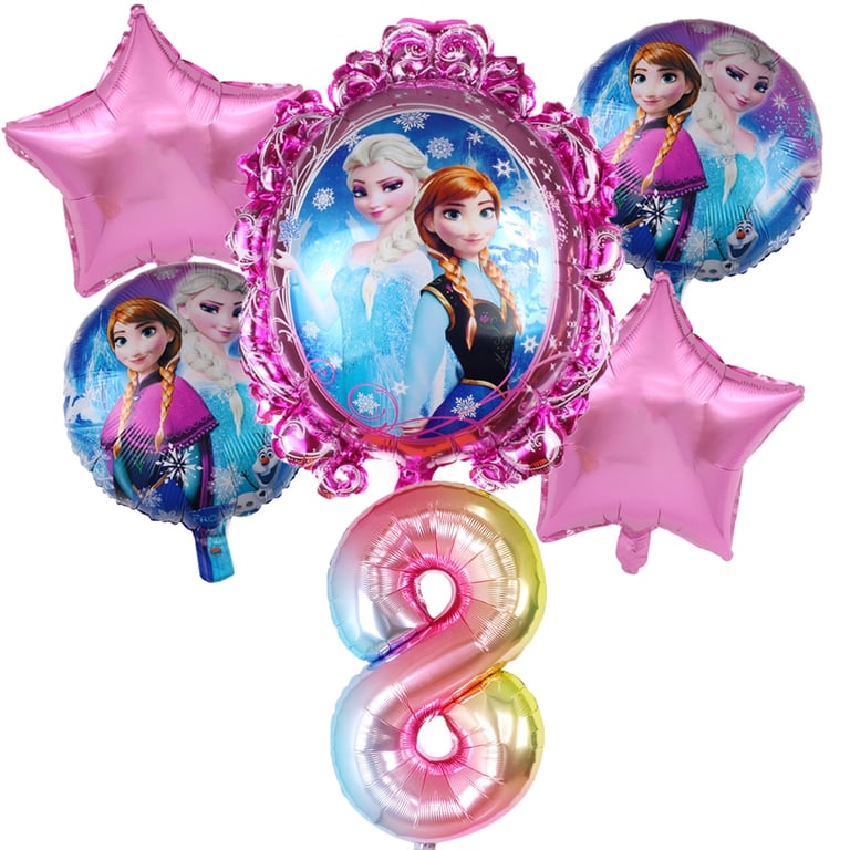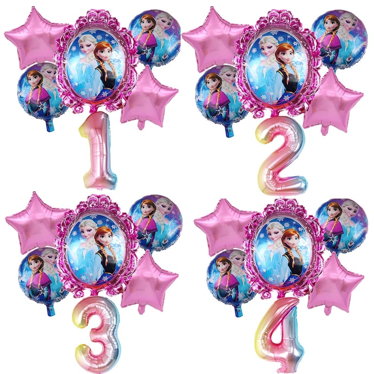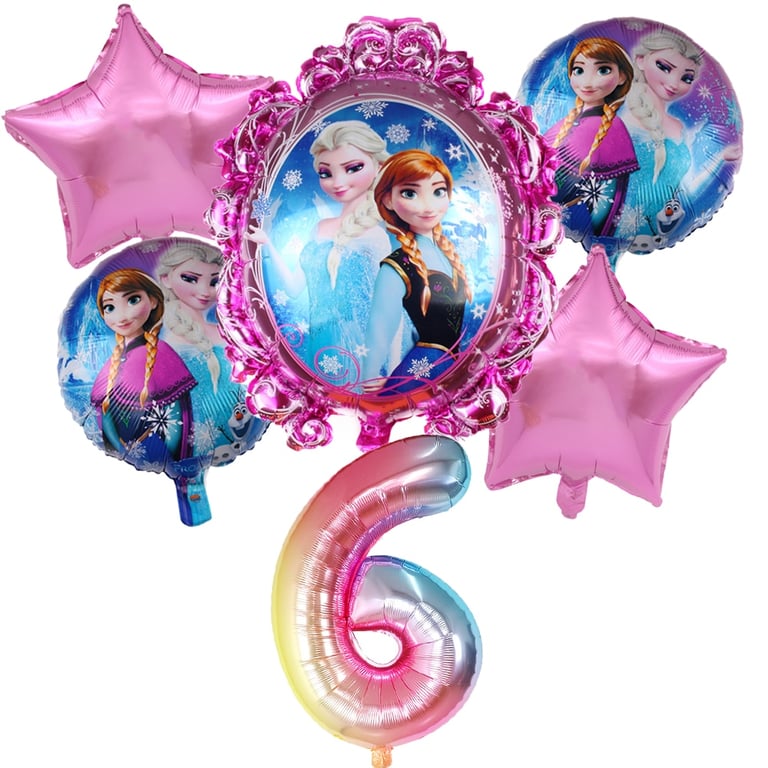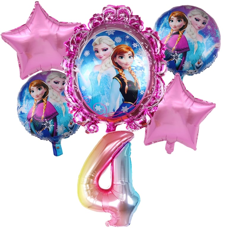 Nel set troverai 1 pezzo di numero, 1 pezzo di grande palloncino con Elsa, 2 pezzi di palloncini a forma di stella, 2 pezzi di palloncini più piccoli