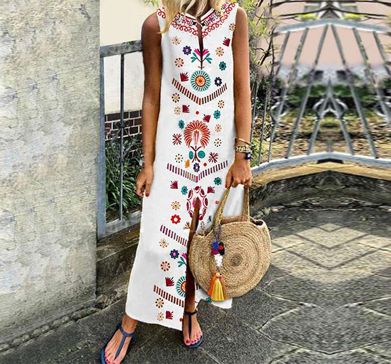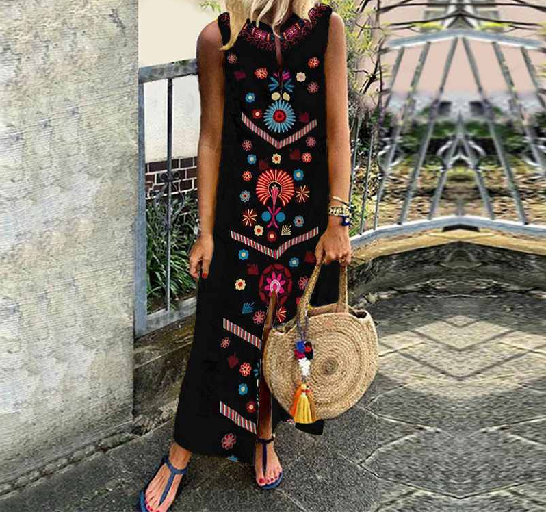 Abito lungo da donna con motivi aztechi e spacco al centro della gonna. Disponibile in bianco e nero.