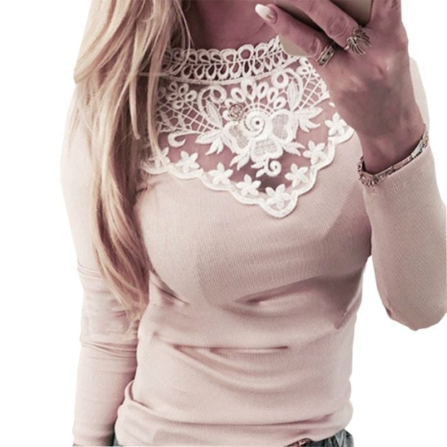 La maglietta ha maniche lunghe e il collo è decorato con pizzo.