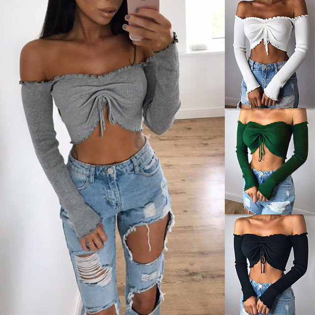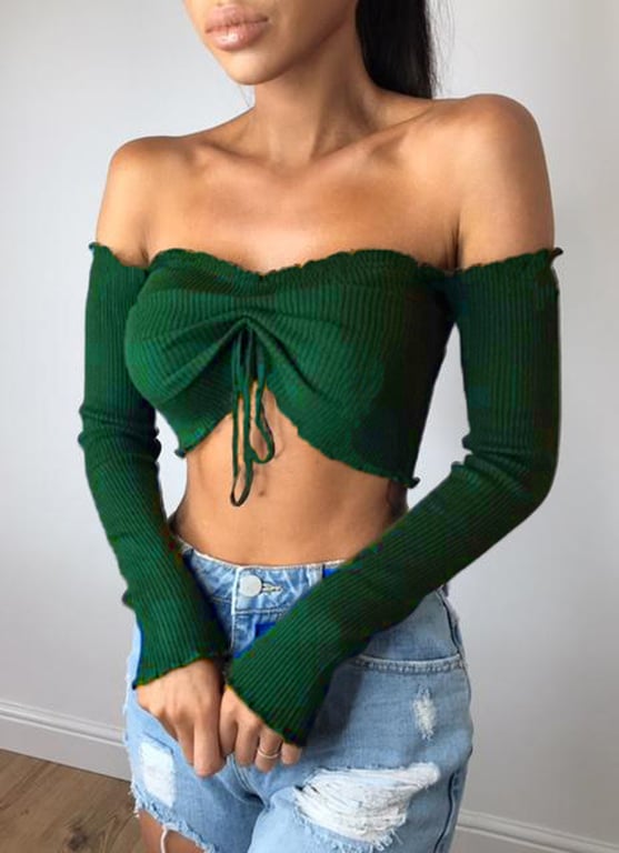 Top alla moda da donna con arricciature e maniche lunghe. Taglio sexy corto con spalle scoperte.