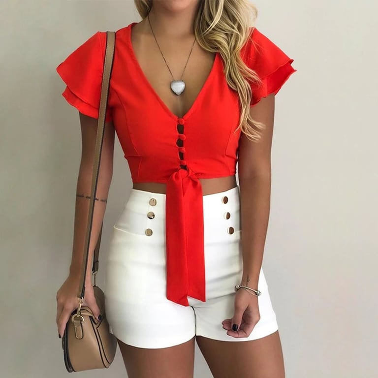Top corto avvolgente da donna con chiusura a bottoni. Ha maniche corte con volant.