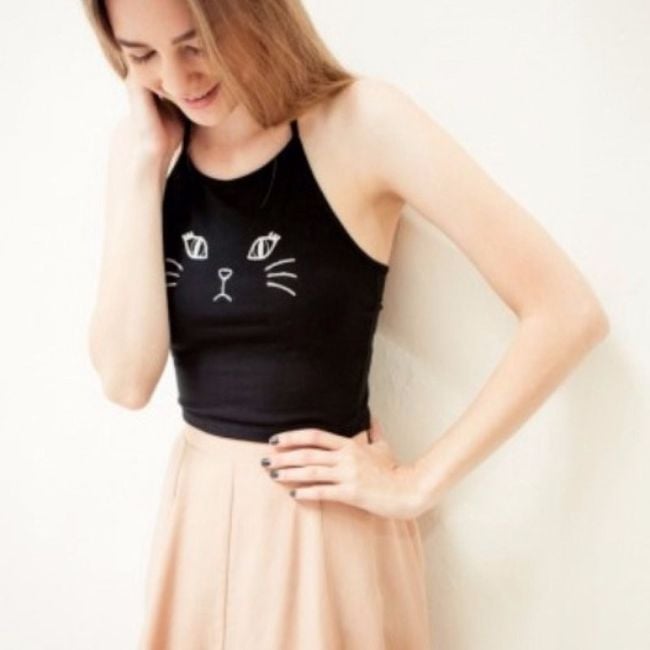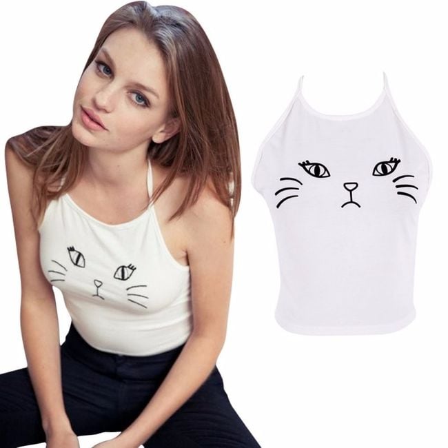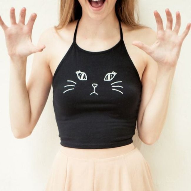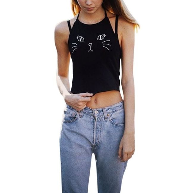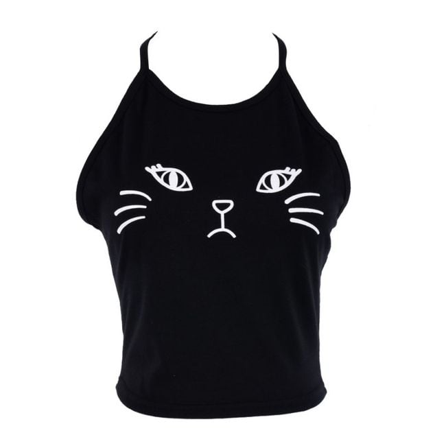 Top corto decorato con una stampa di gatto. Le misure indicate si riferiscono al prodotto, non al corpo.