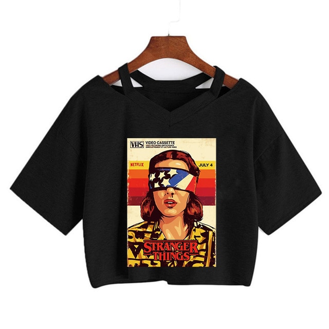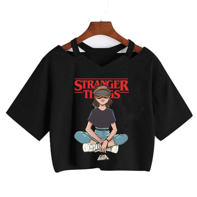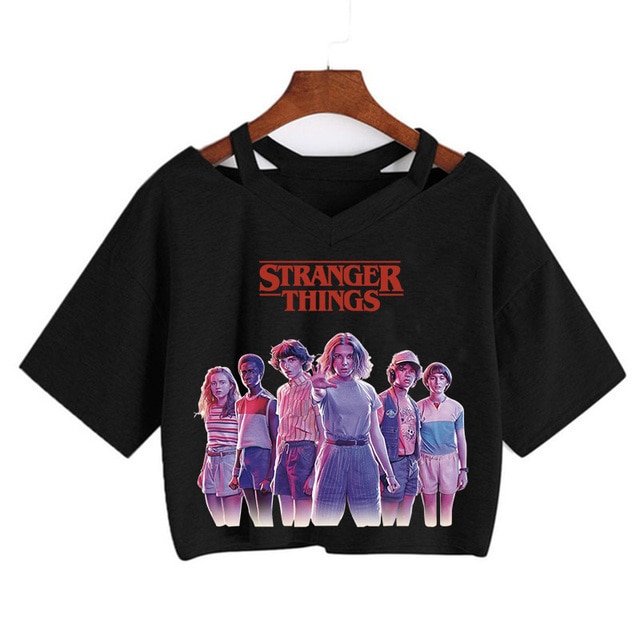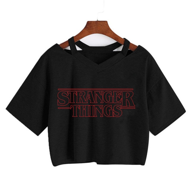 Top corto da donna con stampa di Stranger Things – nero