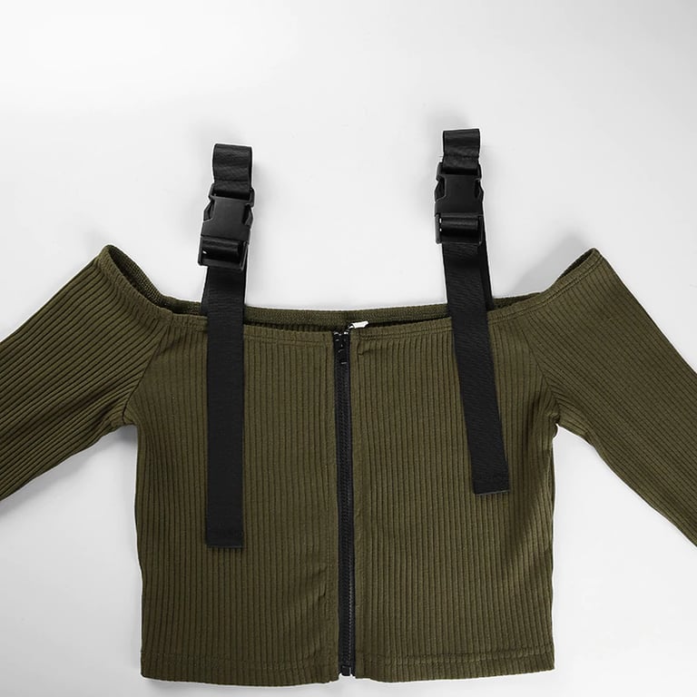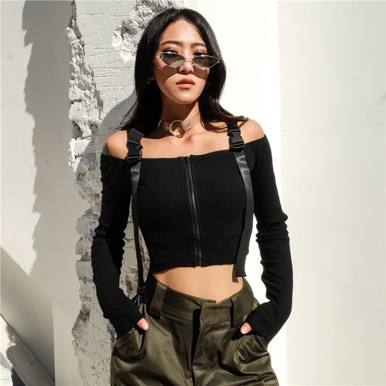 Crop top moderno da donna con zip. Ha le spalle scoperte e maniche lunghe. Puoi scegliere tra due colori.