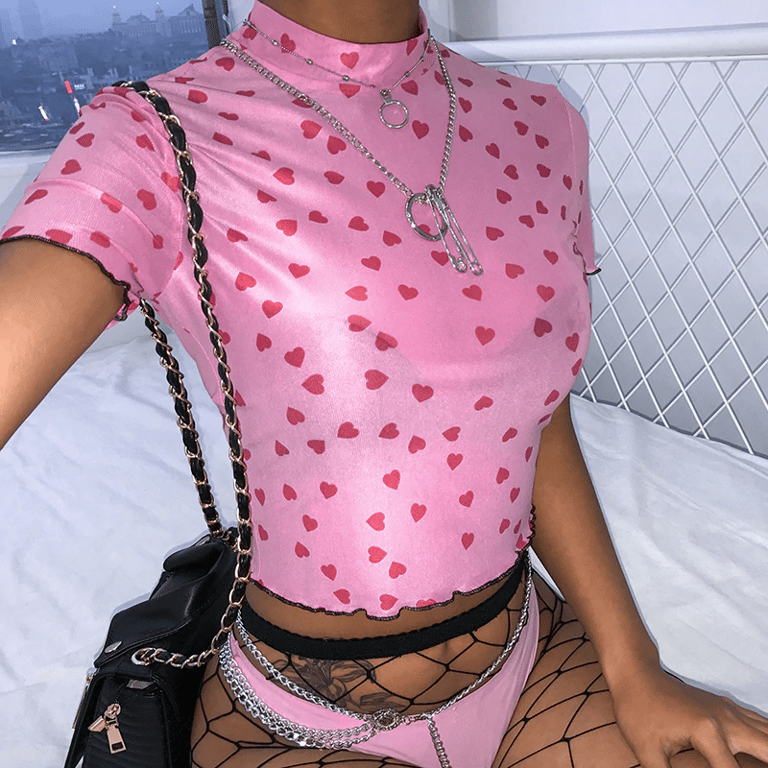 Top corto rosa da donna con maniche corte e cuori. Collo alto, orlo nero ondulato.