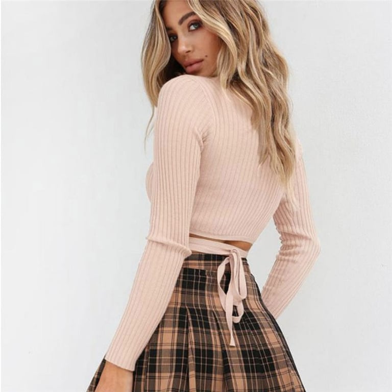 Maglietta crop a righe da donna con maniche lunghe. Con allacciatura a fiocco. Scollatura profonda a V. Disponibile in tre colori.