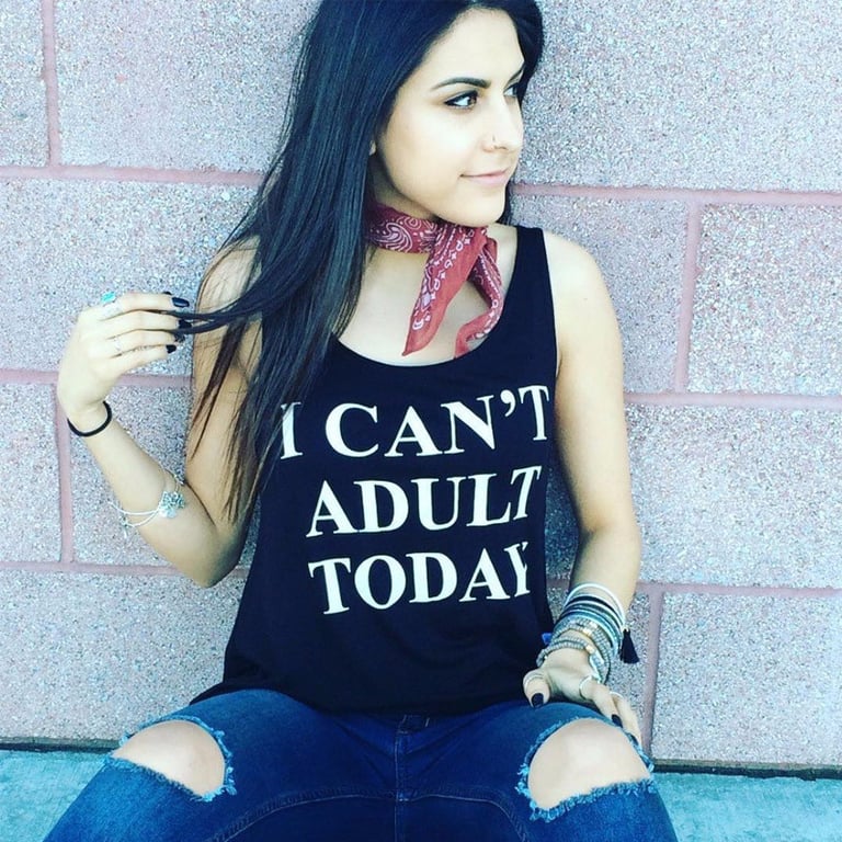 Top da donna senza maniche con scollatura rotonda. Taglio dritto e ampio. Stampa nera con scritta sul davanti.