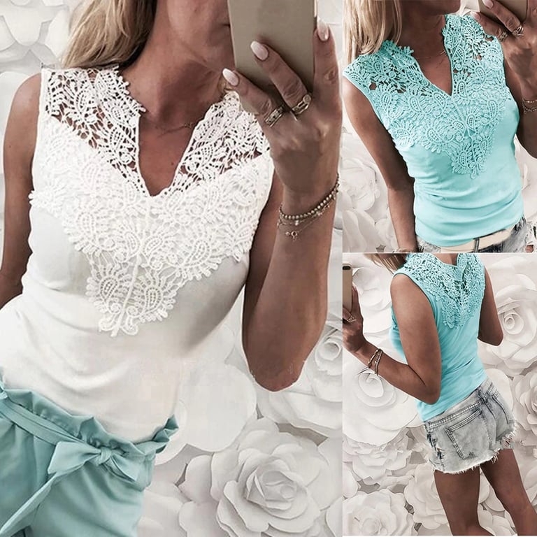 Top estivo da donna con scollatura a V. Decorato con pizzo sul décolleté. Senza maniche. Disponibile in bianco e azzurro chiaro.