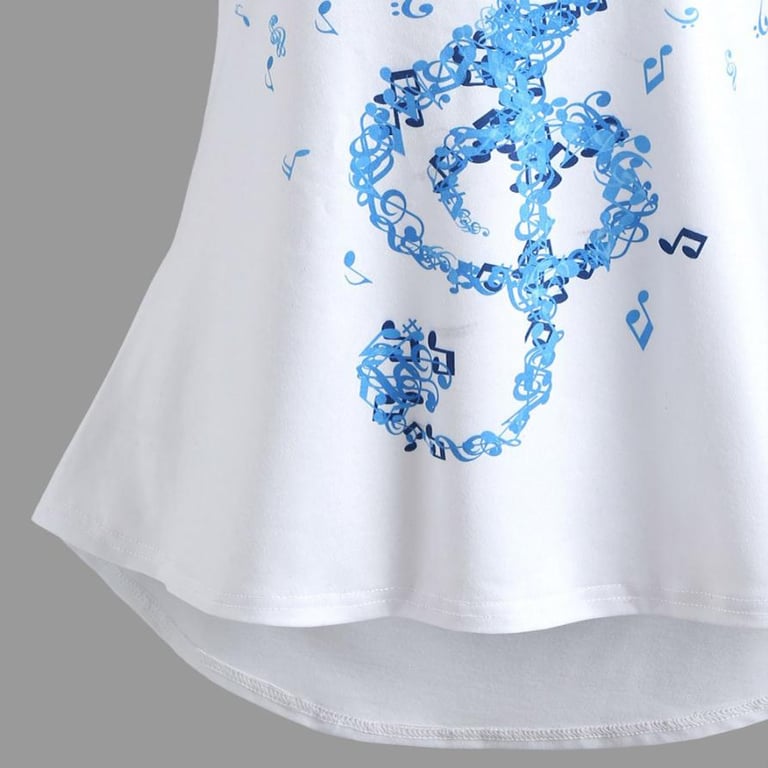 Top estivo stiloso da donna con chiave di violino e note. Decorato sul retro con pizzo blu.
