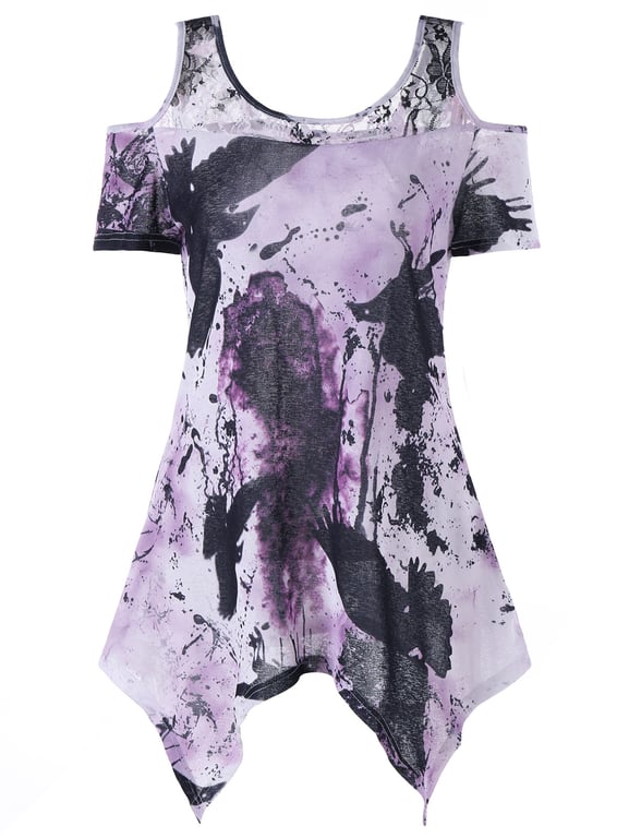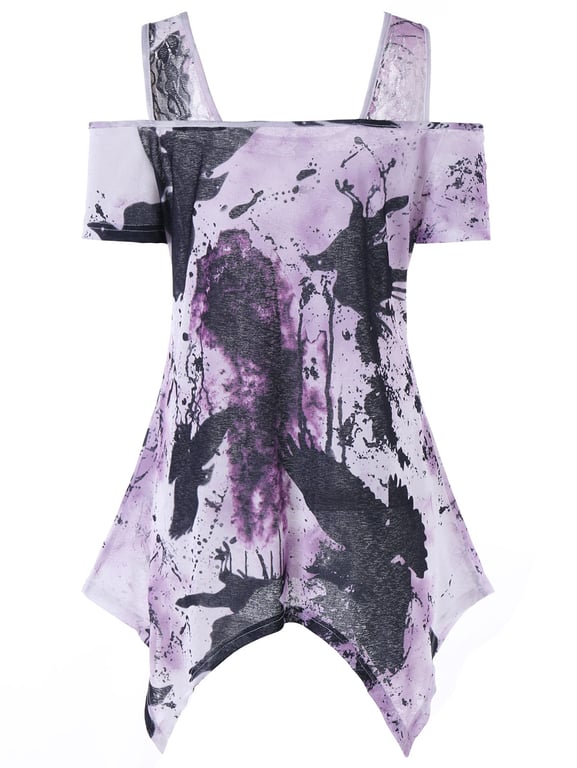Top da donna con maniche corte e spalle scoperte. Stampa stilosa di colori versati.